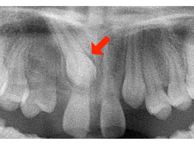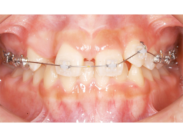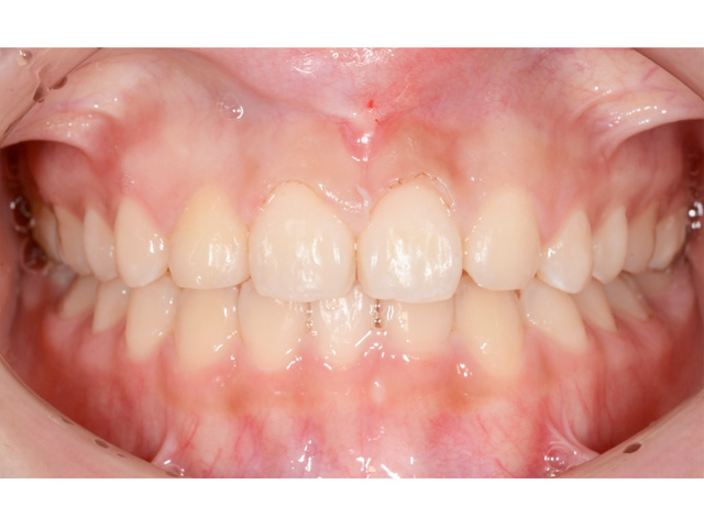 前歯の広いすき間に悩んで当院を受診されました。永久歯が2本不足する上に、向かって左上の犬歯が骨の中に完全に埋まっていました。