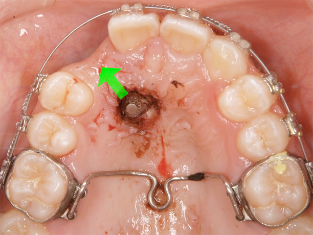 お口の天井部分を麻酔して開き、犬歯にフックをつけて矯正装置を用いて適正な位置まで移動させました。