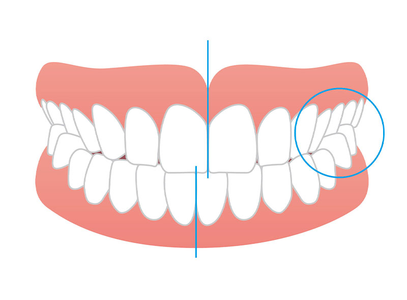 上の歯と下の歯の位置関係が左右で異なる状態を指します。交叉咬合は、片側での咀嚼を助長し、顔面の非対称や顎関節症などの問題を引き起こすことがあります。また、歯の異常な摩耗や歯周組織への過剰な負担も生じやすくなります。