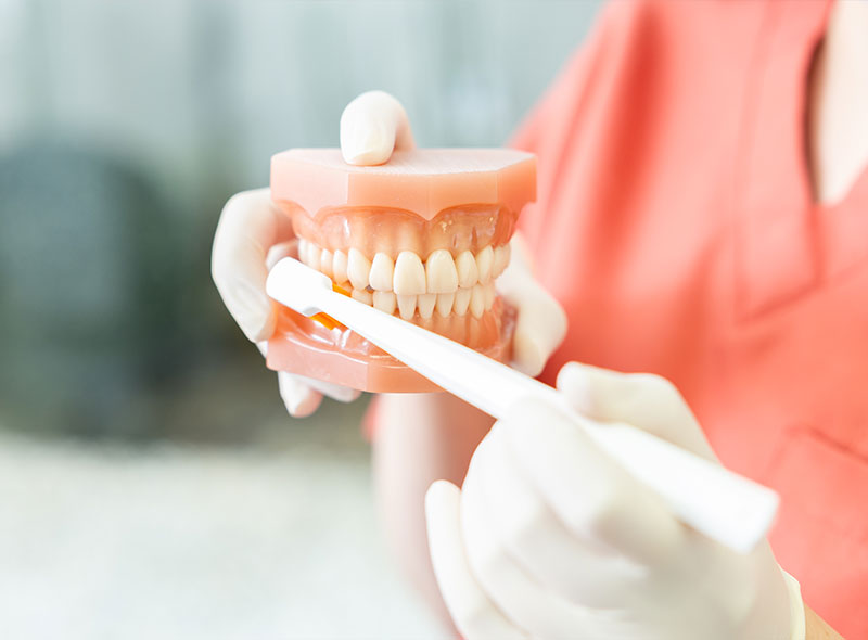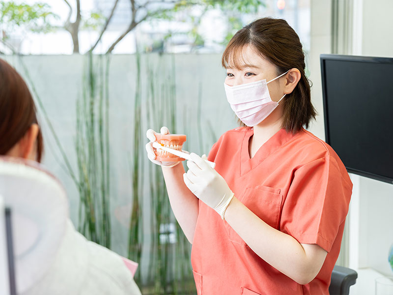 予防の基本は、日々の正しいセルフケアです。専用の染め出し液を使って磨き残しがある部分を患者様ご自身に見ていただき、歯ブラシの当て方や動かし方など、お一人おひとりの癖に合わせた効果的な歯磨き方法を指導いたします。