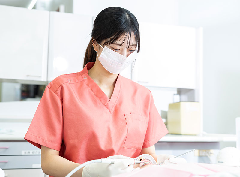 まず患者様を笑顔で迎えます。コミュニケーションを取りながら、口の中の状態を確認し、歯垢・歯石を取り除き、フッ素などの予防薬を塗って虫歯や歯周病の発生を防ぐ仕事を行います。